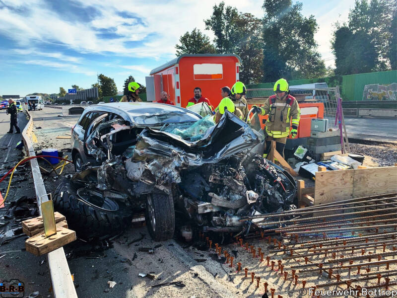 Durch die Feuerwehr wurde die Einsatzstelle gegen den fließenden Verkehr gesichert. Weiter wurde der Brandschutz an der Einsatzstelle sichergestellt. Nachdem der Gesundheitszustand der beiden Unfallbeteiligten überprüft wurde, konnte die technische Rettung eingeleitet werden. Um den eingeklemmten Patienten zu retten, musste die linke Seite des PKW mit hydraulischem Rettungsgerät entfernt werden. Der zweite Patient konnte ohne technische Hilfsmittel befreit werden. Anschließend konnten die Patienten in den bereitgestellten Rettungswagen von einem Notarzt versorgt werden. Ein Patient wurde, aufgrund des Verletzungsmusters, in ein Krankenhaus der Maximalversorgung transportiert. Der zweite Patient wurde in ein Bottroper Krankenhaus transportiert. Die Kräfte der Berufsfeuerwehr, der Freiwilligen Feuerwehr Bottrop Eigen sowie für den Rettungsdienst Kräfte der Rettungswache 3 des DRK waren am Einsatz beteiligt. Für die Dauer des Einsatzes wurde die Autobahn in Fahrtrichtung Oberhausen komplett gesperrt.