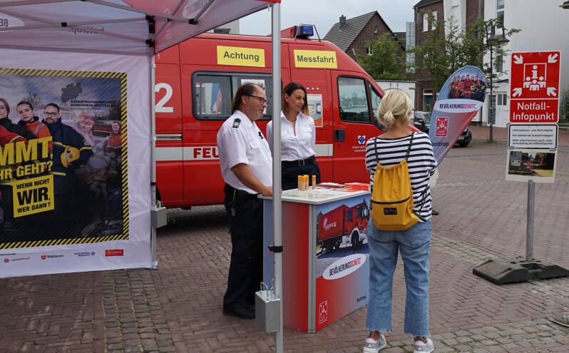 Die Feuerwehr Bottrop war vergangenen Freitag mit einem Informationsstand zum Bevölkerungsschutz auf dem Feierabendmarkt in Kirchhellen vertreten. Im Mittelpunkt der Aktion stand die Warn-App NINA – eine wichtige App, mit der Bürgerinnen und Bürger frühzeitig und direkt über verschiedene Gefahrenlagen informiert werden können.