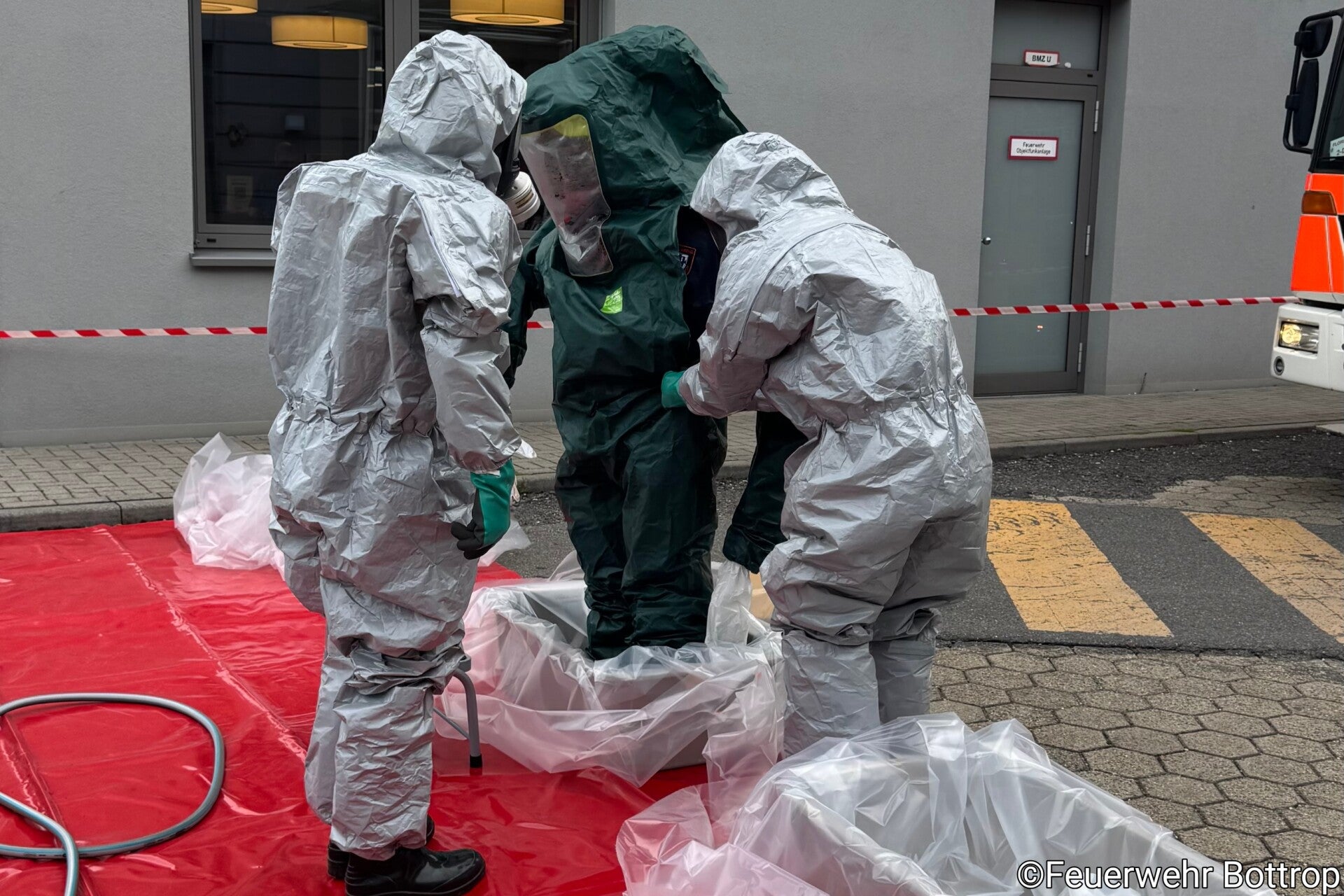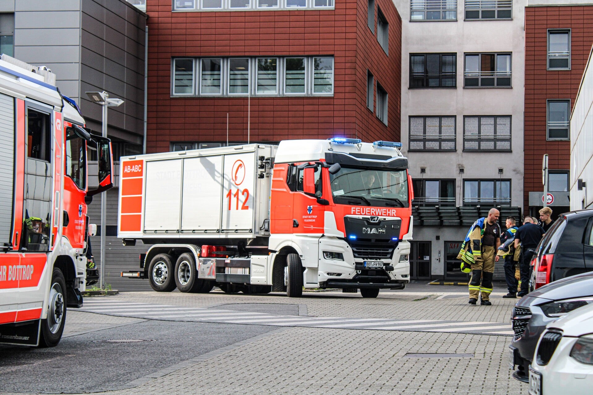 Die Berufsfeuerwehr Bottrop rückte umgehend unter Beachtung entsprechender Schutzmaßnahmen an. Unterstützt wurde sie dabei durch die ehrenamtlichen Einheiten der Ortswehren Altstadt, Boy, Fuhlenbrock und Vonderort. Die Drehleiter wurde durch die Ortswehr Kirchhellen besetzt. Während des Einsatzes übernahm die Ortswehr Eigen den Grundschutz für das Stadtgebiet. Der defekte Kühlschrank wurde durch den Angriffstrupp unter Atemschutz und in luftdichten Schutzsäcken aus dem Gebäude transportiert. Im Außenbereich erfolgte die Übergabe an die BEST AöR, die den Kühlschrank anschließend ordnungsgemäß auf der Deponie entsorgte. Die Feuerwehr Bottrop dankt allen eingesetzten Kräften sowie den Mitarbeitenden des Krankenhauses für das besonnene Verhalten und die gute Zusammenarbeit.