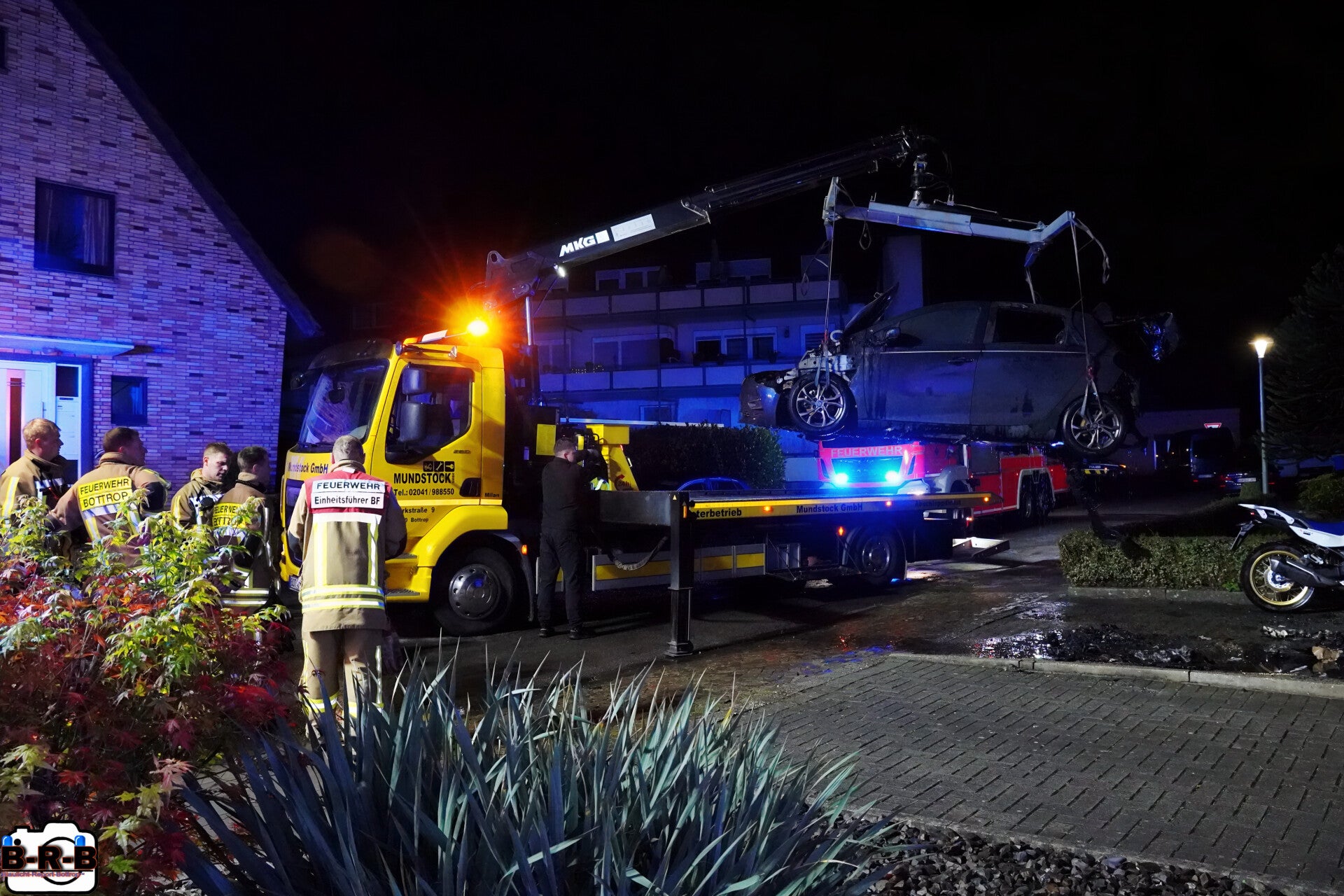 Am Freitag gegen 21:10 Uhr ging bei der Feuerwehr Bottrop ein Notruf ein. Es wurde berichtet, dass ein PKW in Bottrop Eigen stark qualmen soll. Daraufhin wurde ein Hilfeleistungslöschfahrzeug sowie ein Tanklöschfahrzeug mit 8000 Litern Wasser alarmiert. Schon auf der Anfahrt war eine leichte Verrauchung auf der Straße wahrnehmbar. Ein Fahrzeug, welches in einer Einfahrt in unmittelbarer Nähe zu zwei weiteren PKW sowie zu einem Haus stand, rauchte stark am Unterboden. Noch beim Eintreffen der Löschfahrzeuge begann dieses zu brennen und stand innerhalb kürzester Zeit im Vollbrand.