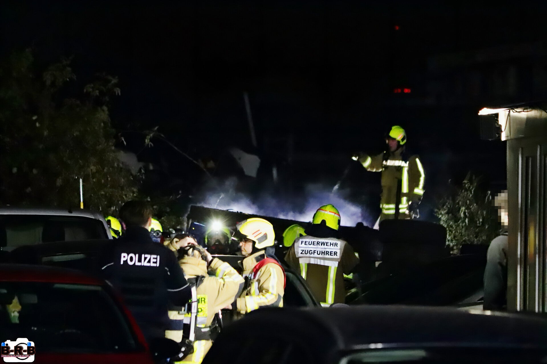 Am heutigen Abend wurde die Feuerwehr Bottrop um 20:31 Uhr zu einem Brand bei einem Autohändler im Bereich der Bahngleise Bahnhofstraße alarmiert. Aus bisher ungeklärten Gründen war dort auf einer Freifläche gelagertes Material in Brand geraten. Die Leitstelle Bottrop alarmierte umgehend den Löschzug der Berufsfeuerwehr sowie die Freiwillige Feuerwehr Bottrop Altstadt. Beim Eintreffen der Einsatzkräfte stand ein Materialcontainer gefüllt mit Restholz und leeren Kraftstoffkanistern sowie zwei IBC Container mit Kaminholz im Vollbrand, sodass sofort drei Trupps unter Atemschutz die Brandbekämpfung mit handgeführten Strahlrohren aufnahmen.
